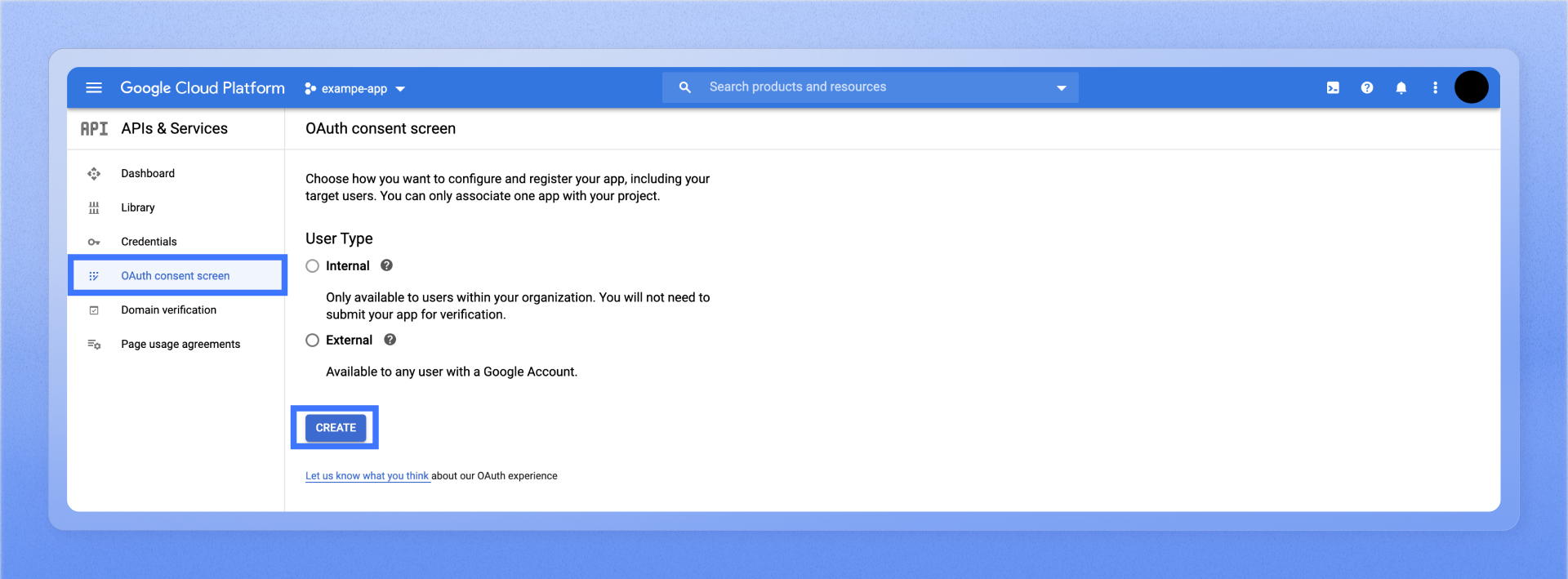 - Navigate to the OAuth consent screen under APIs & Services. Choose how you want to configure and register the Plane app, including your target users, and click Create.